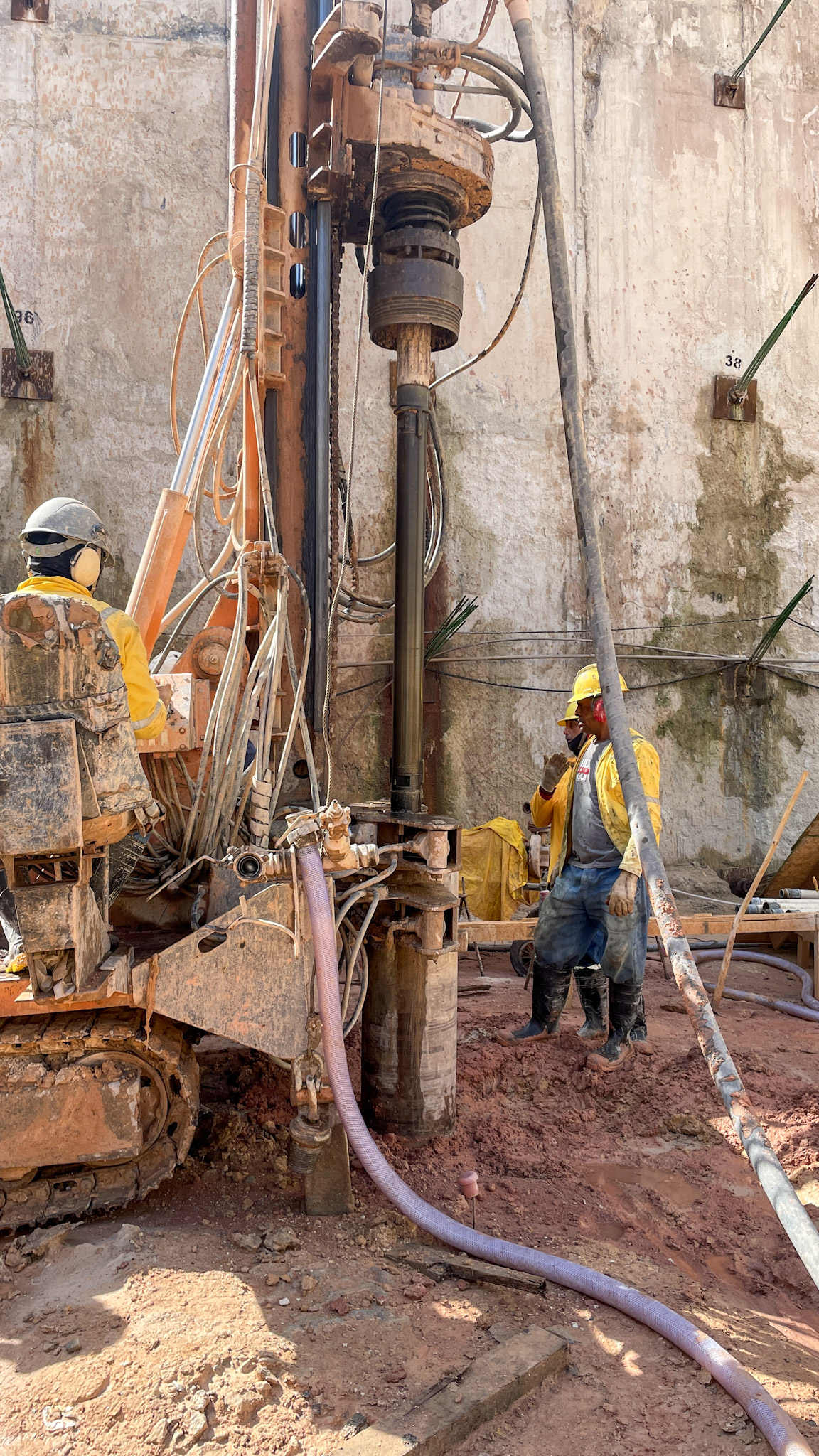 Para superar o desafio, unimos análise técnica e colaboração com nossos parceiros. Aplicamos a Folha de Estudo de Processos (ferramenta Lean Construction que identifica atividades que agregam ou não valor), o que nos permitiu mapear etapas, localizar gargalos e reduzir desperdícios através de ações de melhoria. A cooperação com a Fundap Sondagens e Fundações foi essencial para transformar um processo engessado em um modelo eficiente de execução de estacas. Inicialmente sem procedimentos padronizados e com produtividade de apenas 2 a 3 estacas por máquina/dia, a Fundap foi integrada ao nosso processo de planejamento. Criamos uma parceria baseada em transparência, com participação direta de seus líderes em reuniões semanais para definição de metas, planejamento de frentes e antecipação de restrições. Durante o processo, identificou-se a necessidade de modernizar equipamentos, resultando na aquisição conjunta de um martelo de fundo mais moderno, que reduziu significativamente o tempo de perfuração em rocha. Em paralelo, desenvolvemos um procedimento padronizado com práticas de gestão, logística e segurança.