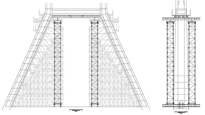 Através do uso do Sistema MK, formado por vigas metálicas e elementos de união (ligas) por parafusos, projetou-se uma estrutura em segmentos de treliças, que seriam todas pré-montadas no chão e içadas com a grua formando a mesma geometria do mastro, servindo de forma das faces inferiores dos pilares inclinados e da viga travessa, e de plataforma de acesso e apoio às formas laterais. Como a estrutura funcionaria como um conjunto único espacial e ancorado ao concreto das estruturas previamente executadas, a mesma então estaria apta a suportar todos os esforços, verticais e horizontais, inclusive de vento, e os transmitir às fundações do mastro.