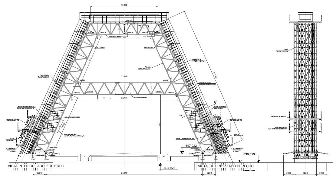 O requisito executivo determinante nesta obra foi que os pilares inclinados do mastro não eram autoportantes durante sua execução em etapas de concretagem e necessitavam permanecer escorados até que os dois pilares fossem consolidados com a viga travessa que estava a 30m de altura, e só a partir deste momento é que a estrutura tornar-se-ia autoportante e o escoramento poderia ser removido.