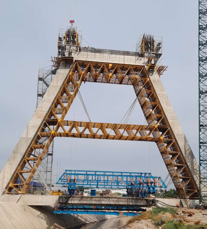 Devido à grande altura dos pilares, a montagem de torres de escoramentos convencionais demandaria muito trabalho de montagem em altura e, como seria necessário manter estes escoramentos até o tempo de cura do concreto da viga travessa , os mesmos bloqueariam o espaço na projeção da estrutura o que retardaria o início da montagem dos carros de balanço sucessivo cuja aduela de disparo está exatamente sob a projeção do mastro.