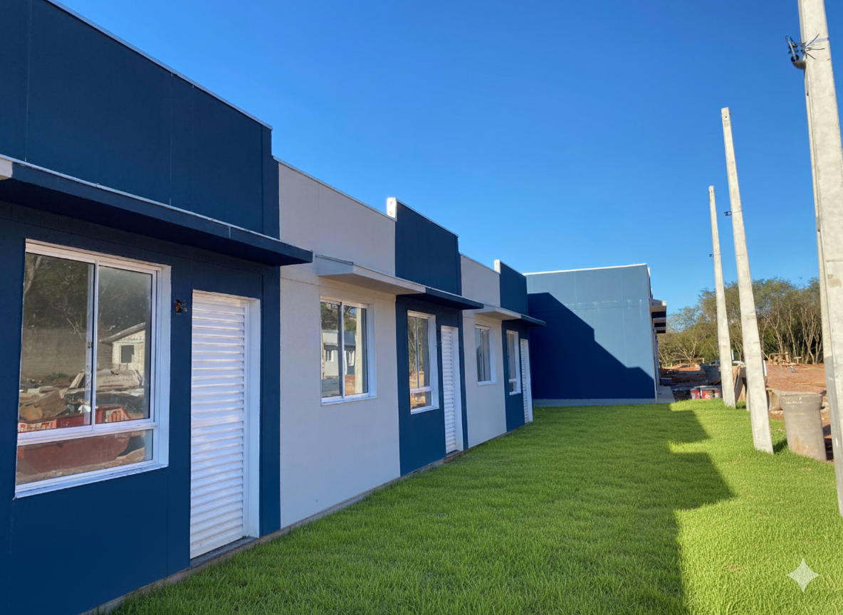 Entrega de mil casas térreas da fundação ao acabamento em cerca de 30 cidades no RS. Uso de banheiro pronto, paredes painelizadas em LSF completas, forro pronto e telhado semi-pronto.