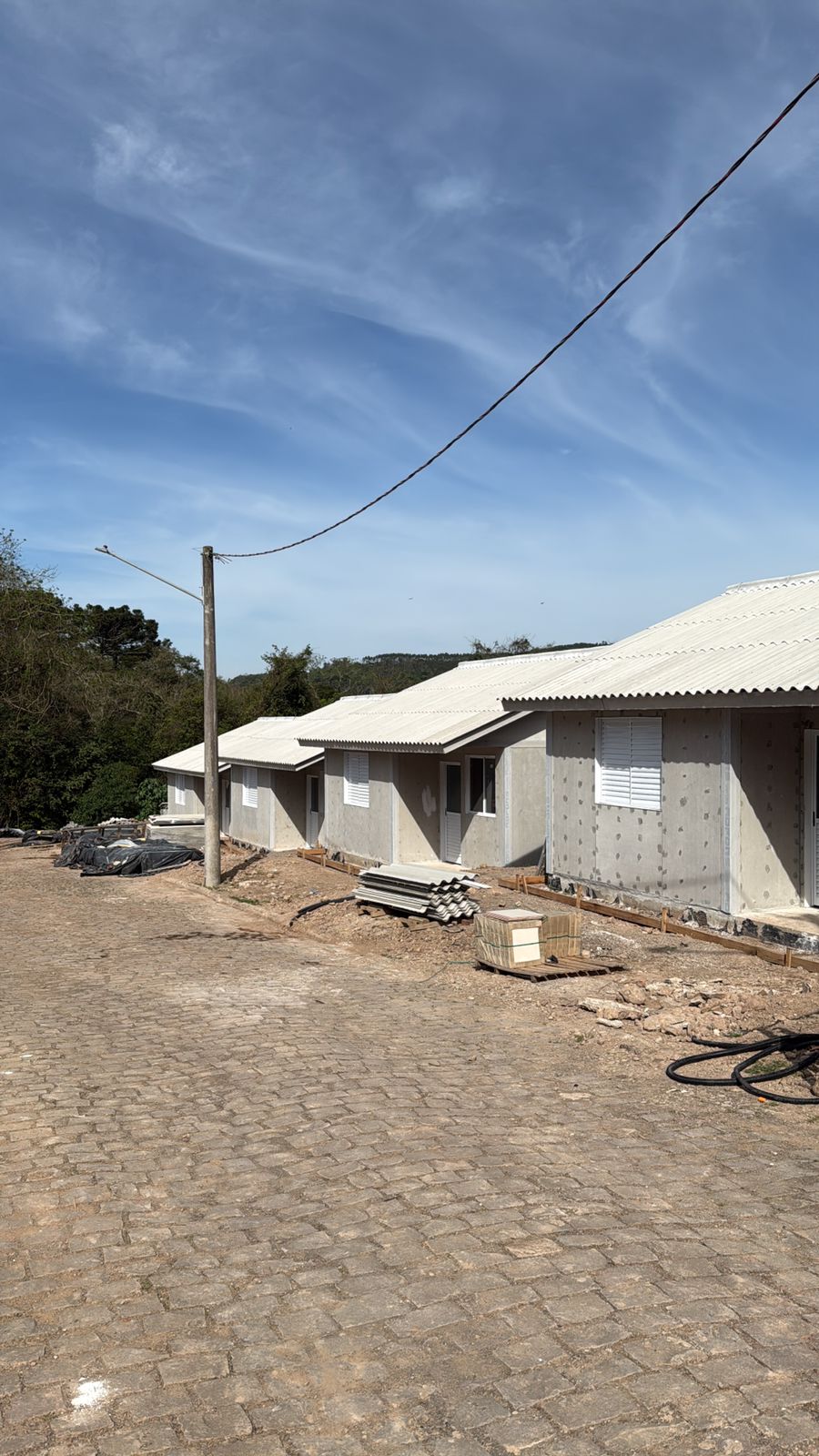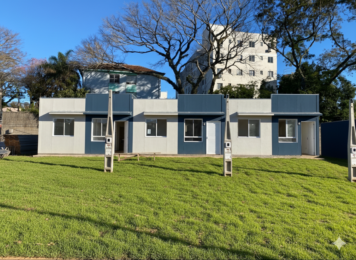 Entrega de mil casas térreas da fundação ao acabamento em cerca de 30 cidades no RS. Uso de banheiro pronto, paredes painelizadas em LSF completas, forro pronto e telhado semi-pronto.