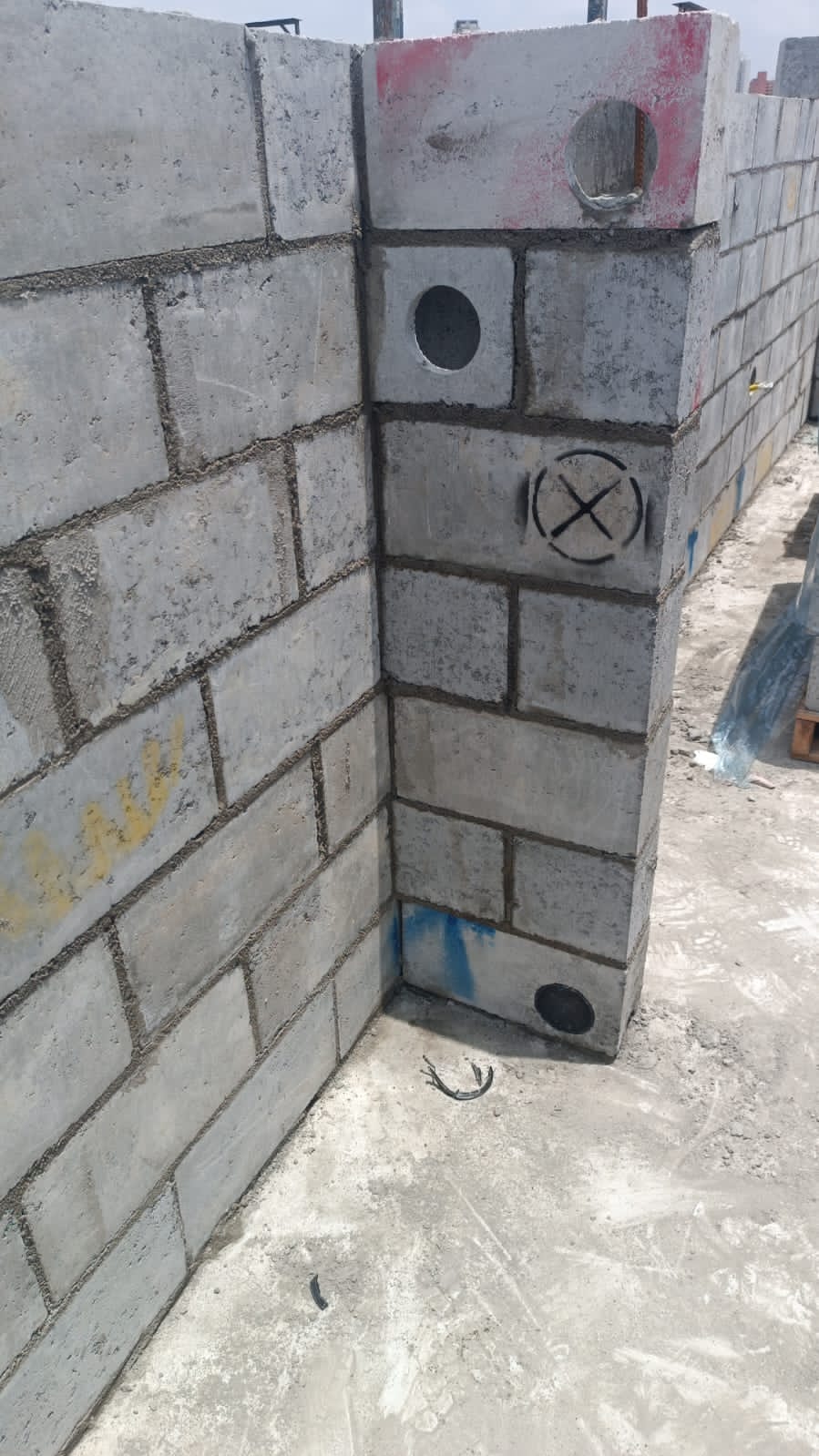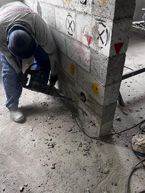 Além disso, os arranques das colunas de graute são rigorosamente conferidos com o projeto estrutural, e a furação aplicada nos encontros de alvenaria — especialmente nos cantos das paredes — foi testada, aprovada e registrada em procedimento técnico, garantindo melhor amarração da ferragem e maior confiabilidade da estrutura.